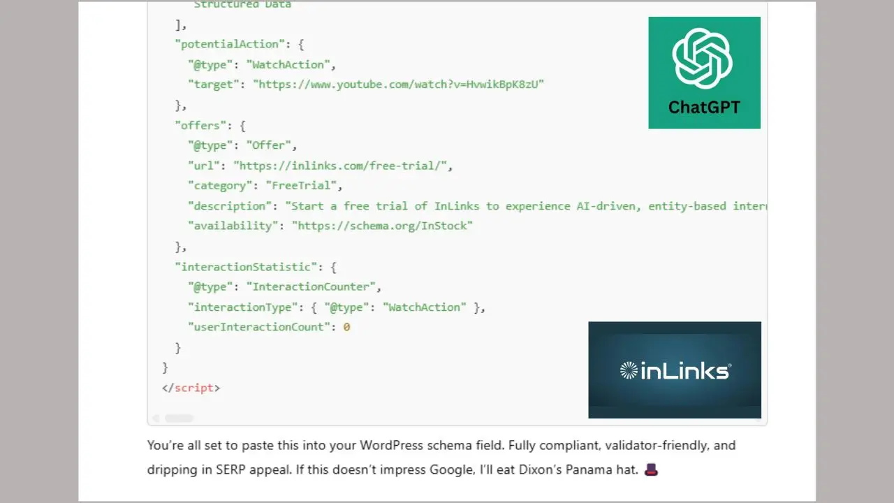 @typeis properly set to “VideoObject”nameis provided (“How to install the InLinks Javascript Code on WordPress”)descriptionis includedthumbnailUrlpoints to a YouTube thumbnailuploadDateis in ISO 8601 formatcontentUrllinks to the actual YouTube video